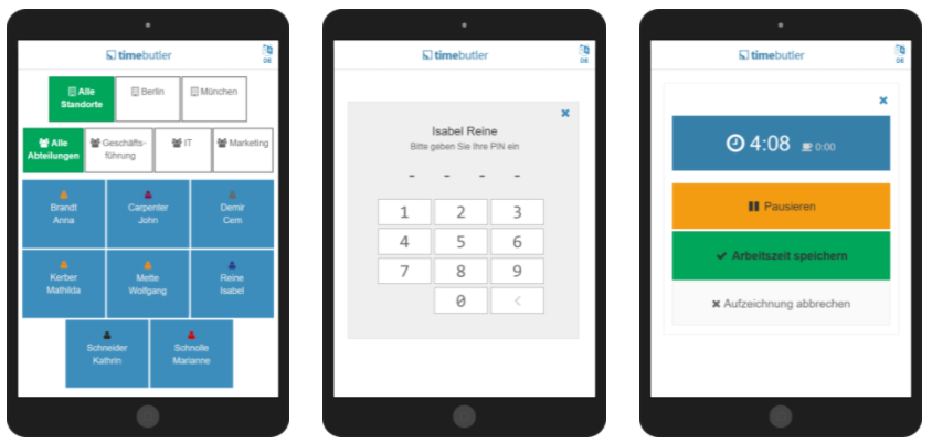 Sie können das Zeiterfassungsterminal auf einem handelsüblichen Tablet aktivieren. Das Tablet stellen Sie am Büro- oder Firmeneingang bereit (es gibt professionelle Halterungen für Tablets) und jeder Mitarbeiter kann dann morgens am Zeiterfassungsterminal seine Zeiten stempeln, mit wenigen Klicks. Sie erhalten also ein vollwertiges Zeiterfassungsterminal für den günstigen Preis eines Tablets - und haben die Zeiten automatisch direkt im Timebutler integriert.